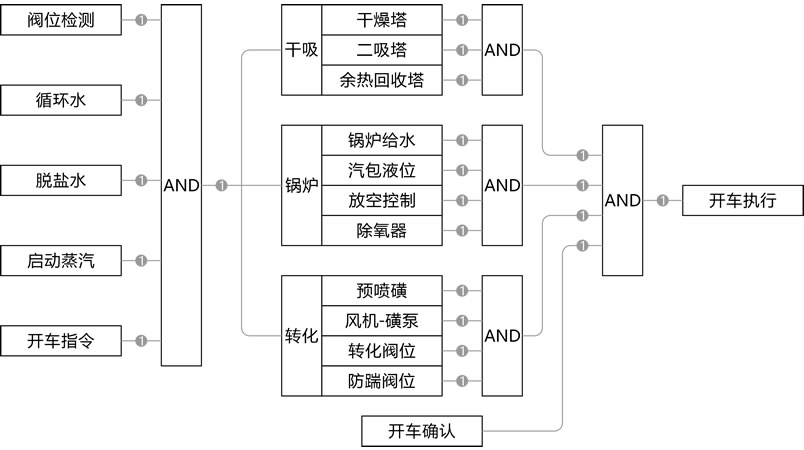 硫磺制酸裝置開車是一個(gè)復(fù)雜且漫長(zhǎng)的過程,在這個(gè)過程涉及到開車準(zhǔn)備的順序、工藝參數(shù)的調(diào)整、裝置上控制閥的設(shè)置、以及開車前的所有條件確認(rèn),才能啟動(dòng)風(fēng)機(jī)噴硫磺開車,由于開車過程是裝置工藝流程從靜態(tài)轉(zhuǎn)變?yōu)閯?dòng)態(tài)過程工藝參數(shù)會(huì)發(fā)生劇烈的變化,當(dāng)裝置準(zhǔn)備不當(dāng)就會(huì)發(fā)生事故,因此,需要對(duì)開車過程進(jìn)安全控制?;陂_車過程的變化,設(shè)計(jì)一套完善合理的控制邏輯非常重要。