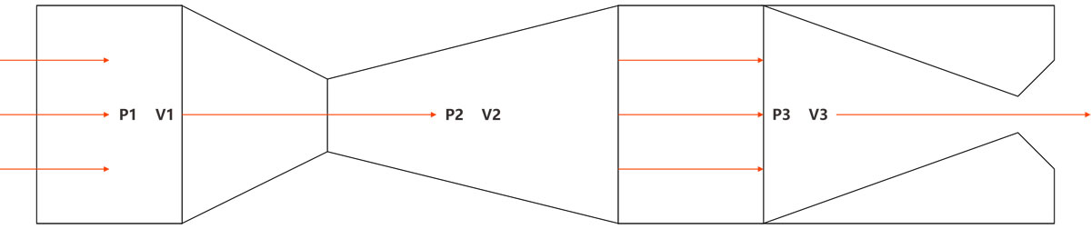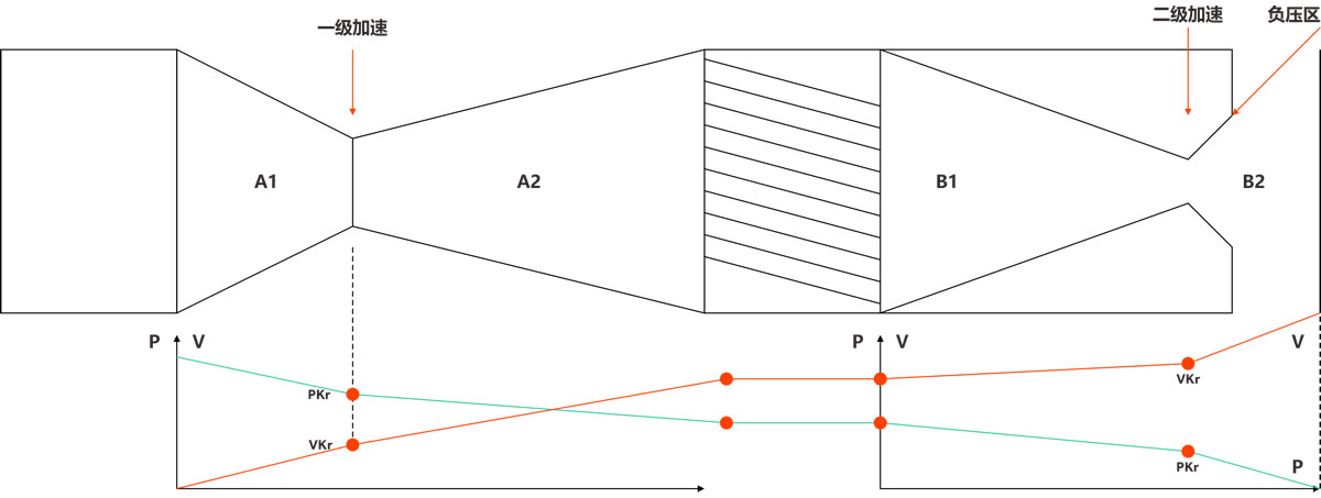 采用兩級拉瓦爾噴管技術(shù)的高效噴嘴能夠顯著提升液硫的離心力。拉瓦爾噴管的前端設(shè)計(jì)為逐漸收縮至一個(gè)狹窄的喉部隨后在喉部之后又逐漸擴(kuò)張。液硫在通過第一級拉瓦爾噴管加速后,會(huì)進(jìn)入第二級噴管,在那里它再次被加速,并在穿過第二級狹窄的喉部后從噴嘴噴出。這種結(jié)構(gòu)設(shè)計(jì)使得液硫在噴嘴截面積變化的作用下,將靜壓能有效地轉(zhuǎn)換為動(dòng)壓能,從而賦予液硫高速噴射并霧化的動(dòng)力。
