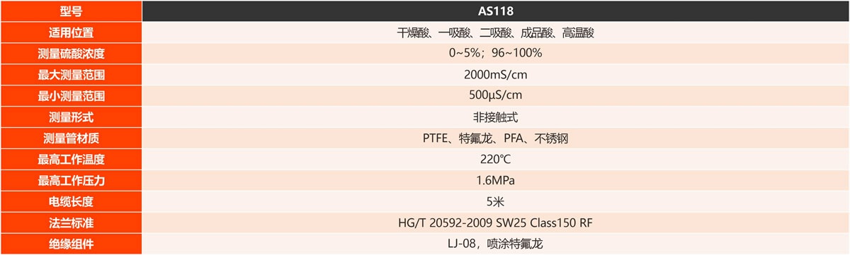 AS118傳感器適用于高溫酸、干燥酸、一吸酸、成品酸以及稀釋硫酸等多種環境下的應用。該傳感器的測量準確性不受介質流速和流向的影響,但無法測量含有氣體的介質電導率因此必須確保測量介質是流動的且不含氣體。AS118傳感器的測量管采用不銹鋼材質并內襯聚四氟乙烯,安裝法蘭由耐腐蝕材料制成,而溫度傳感器作為獨立元件,安裝在傳感器出口的溫度套管中。傳感器的感應線圈則安裝在內襯聚四氟乙烯的測量管外部,允許高溫硫酸或堿液等介質在測量管內部流動。