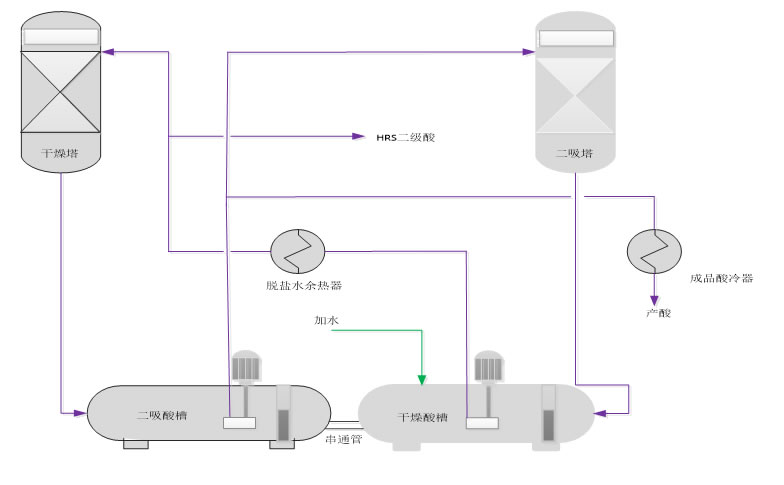 把除氧器原始溫度從104℃調(diào)整到135℃,余熱鍋爐產(chǎn)汽壓力從3.82MPa提升到6.4MPa,經(jīng)初步估算可得,整個(gè)裝置中壓產(chǎn)汽率從1.2t/t酸可提高到1.3t/t酸,6.4MPa蒸汽也增大了發(fā)電機(jī)的發(fā)電效率。干吸流程中,干燥酸通過(guò)脫鹽水預(yù)熱器換熱后進(jìn)入干燥塔,干燥下塔酸通過(guò)二吸泵直接進(jìn)入二吸塔吸收,吸收后的酸進(jìn)入干燥循環(huán)槽,二吸不設(shè)置酸冷器,循環(huán)酸槽之間設(shè)串通管平衡兩槽液位。如下圖所示