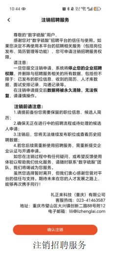 如您以公司管理員身份申請注銷招聘服務(wù),請務(wù)必仔細(xì)閱讀《招聘服務(wù)注銷協(xié)議》相關(guān)條款。請注意:一旦提交注銷申請,該公司名下的所有招聘數(shù)據(jù)(包括職位、簡歷等)將被永久清除且無法恢復(fù),請謹(jǐn)慎操作。