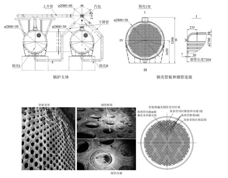 生產運行中,余熱火管鍋爐泄漏常發生在前煙箱管板焊縫失效的位置,余熱火管鍋爐是由筒體和管板構成,管板與火管之間采用焊接結構。在管板焊接位置除承受設計壓力載荷外[1],還承受前煙箱高溫煙氣(約1100℃)與鍋筒內飽和水溫度(約250℃)差異較為明顯的溫度載荷,因此管板與火管的焊縫同時承受壓力 、溫度兩種工況下的應力改變,在該位置產生最大應力,當運行中管板焊接處出現腐蝕,將引發焊縫失效出現泄漏。