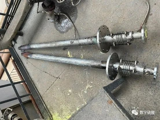 該客戶為某大型化工企業,有2套400 kt/a硫黃制酸裝置,焚硫爐均采用臥式布置,外殼為鋼制圓筒內襯耐火磚和保溫材料,在爐內設置兩道擋墻,空氣經螺旋片以湍流狀從硫黃噴槍四周進入焚硫爐。每個焚硫爐采用2支200 kt/a標準產能機械固定式霧化硫黃噴槍,噴槍長度2 650 mm,霧化噴嘴直徑12 mm,采用法蘭壓蓋密封。傳統噴槍霧化液體硫黃時,硫黃滴落在焚硫爐底部流淌燃燒,導致焚硫爐運行溫度超高,而且還經常出現槍身變形、噴咀保溫蒸汽泄漏、噴咀堵塞等故障,導致停產。