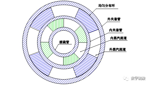經過分析,導致硫黃噴槍彎曲的主要原因是槍身受熱應力分布不均。高效硫黃噴槍保溫夾套在設計時,對槍身受熱應力變化做了分析。裝置運行時燃燒火焰受氣流漩渦影響,火焰會對硫黃噴槍前部加熱,而前部區域是受火焰炙烤的,因此噴槍前部會有熱應力膨脹。為了使噴槍熱應力膨脹一致,需要在槍身內部使保溫蒸汽分布均勻。因此我們在槍身夾套流通面積上,設置了4道保溫蒸汽均勻分布環(見上左圖),用均勻分布環強制混合每段蒸汽溫度,使進入下一段的蒸汽溫度一致。從而達到噴槍槍身溫度一致,避免熱應力膨脹使槍身。